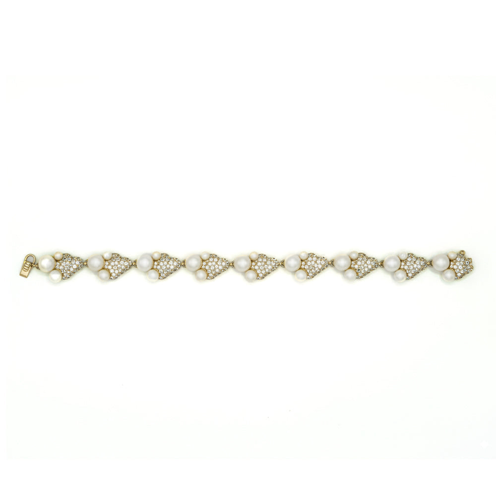 A sparkling array of rainbows stacked together forming a beautiful statement piece of jewelry. Wear with a solid-colored outfit for your rainbow set to shine. Crafted beautifully in freshwater pearls, hand-set cubic zirconia's with each little rainbow carefully set together to form a bracelet.