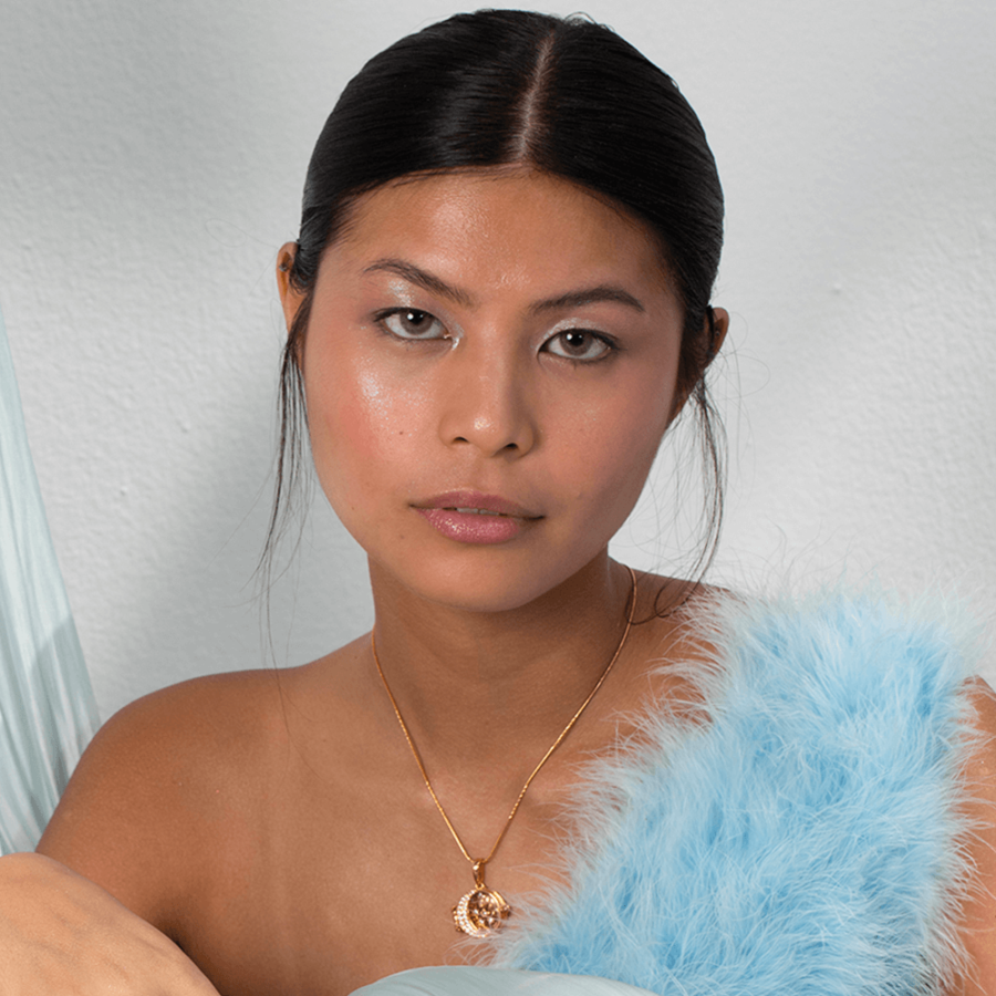 This layered otherworldly coin-sized pendant symbolises the alignment of the sun, moon & stars, delicately handcrafted in sterling silver and covered in rose gold vermeil, sparkling in cubic zirconia.