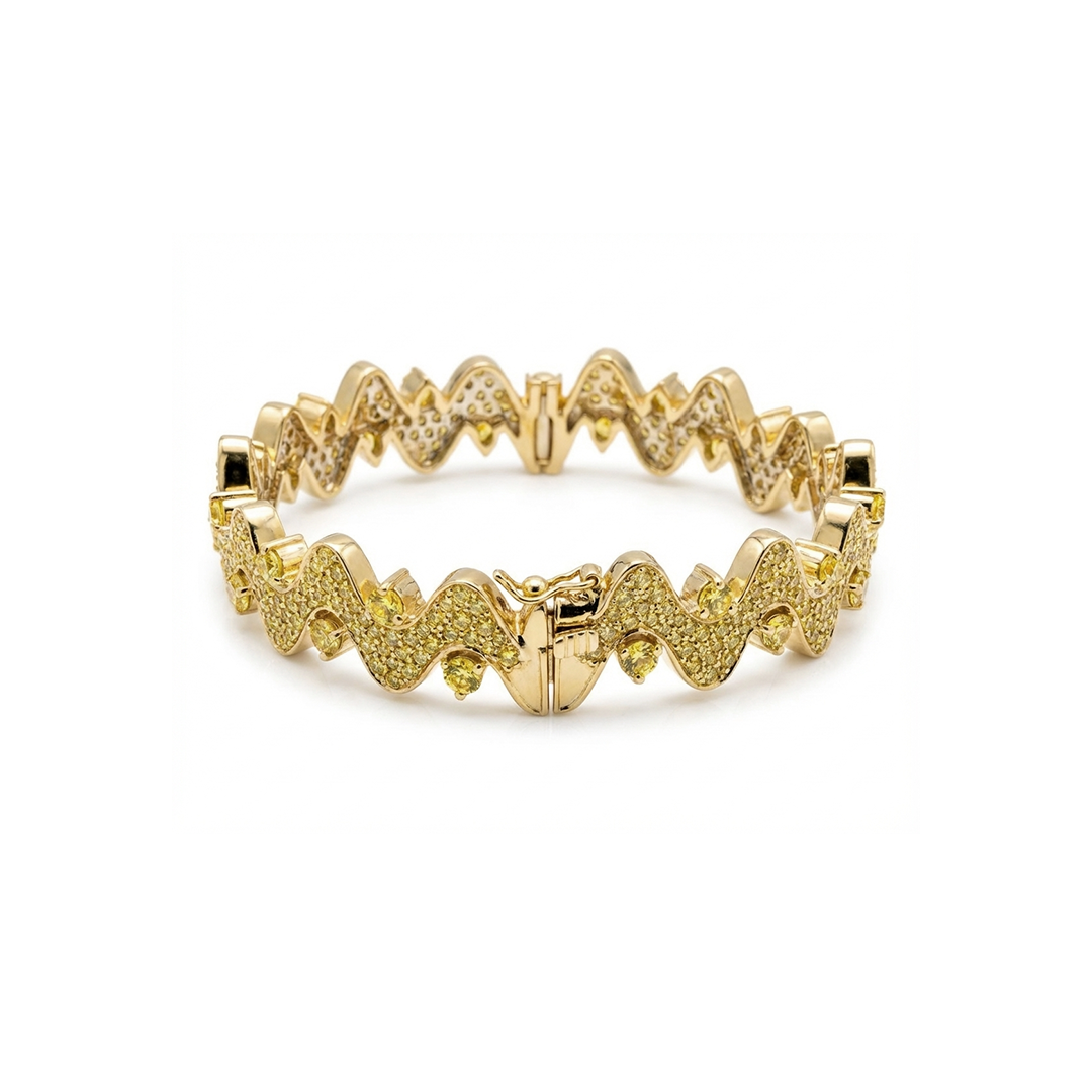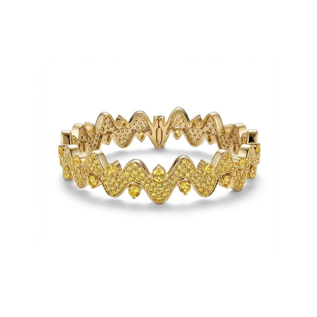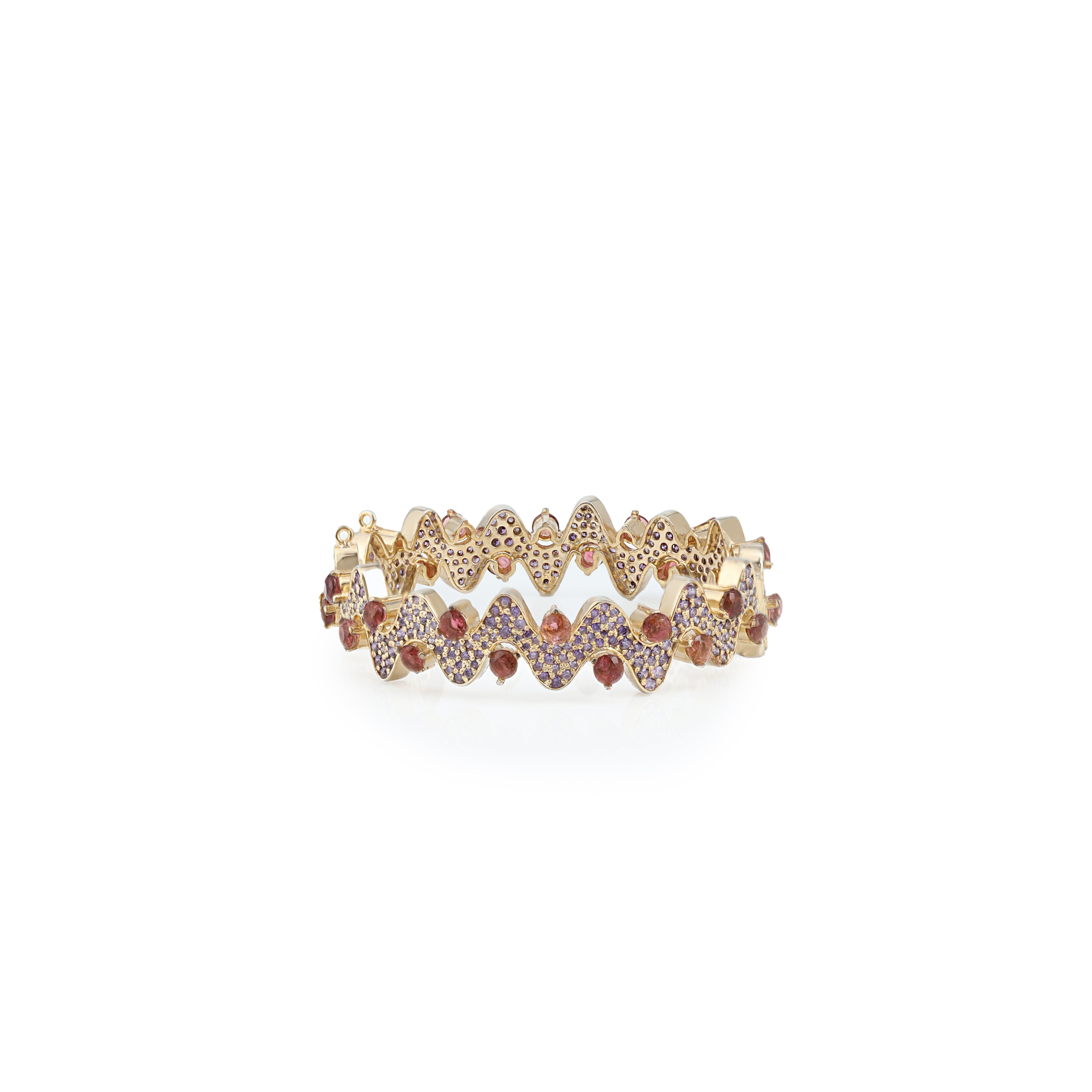 A heartbeat-shaped bangle in sterling silver with gold vermeil, adorned with tourmaline stones — elegant, artistic, and timeless.