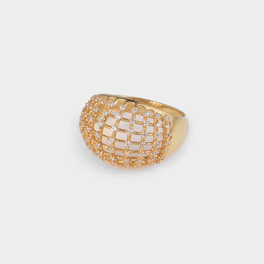 Delicately hand-crafted in sterling silver and covered in thick yellow gold vermeil, the honeycomb ring is beautifully studded in sparkling cubic zirconia.