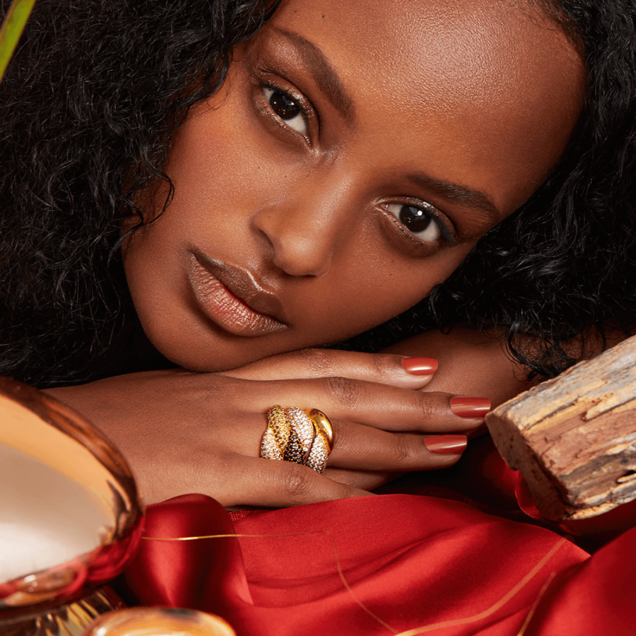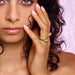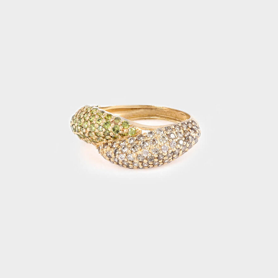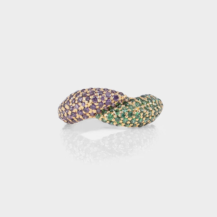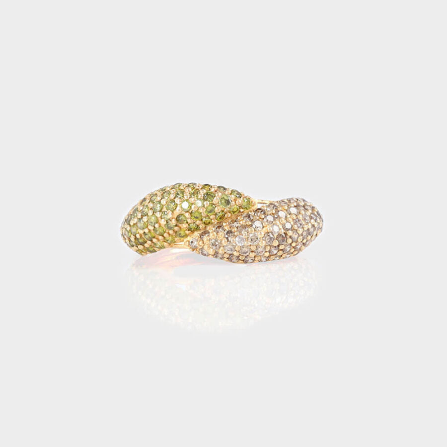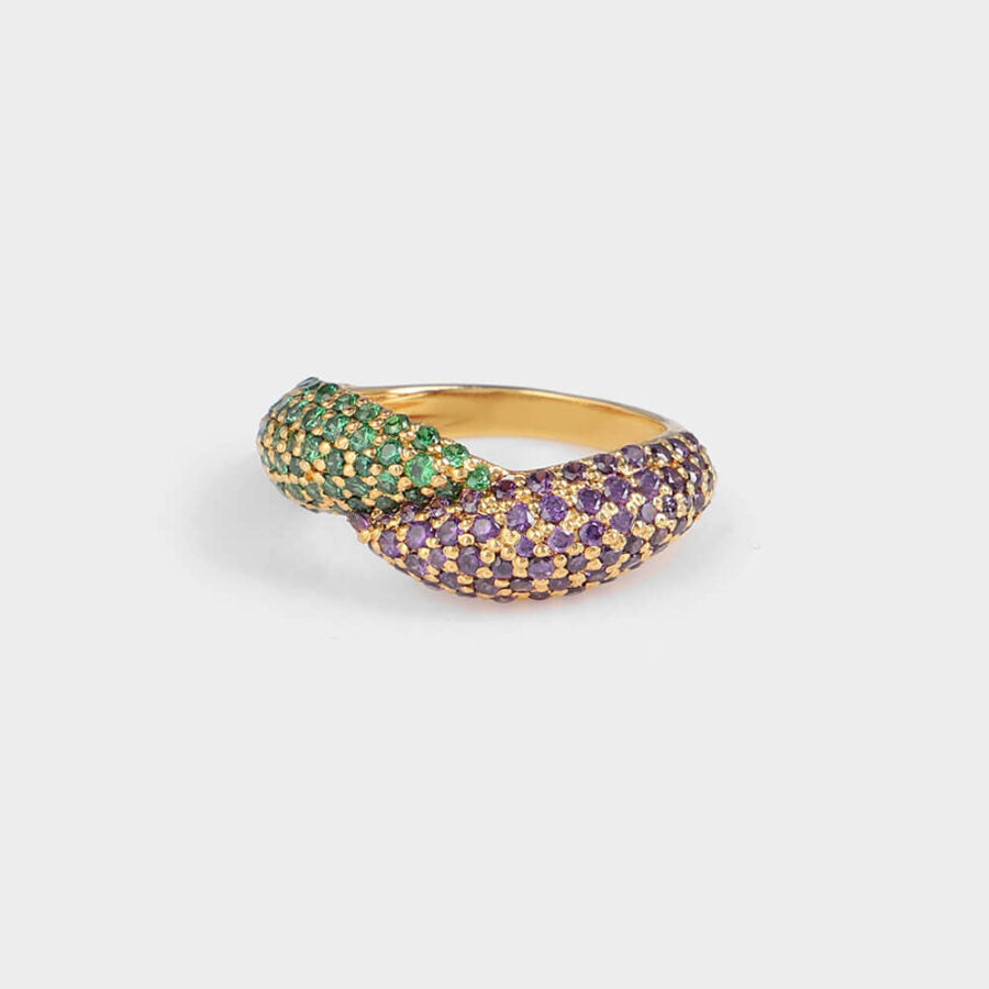 The two serpents locked together representing a love that goes beyond the material world, immortalised in history. Made in sterling silver with thick gold vermeil and set beautifully in grey and green cubic zirconia.